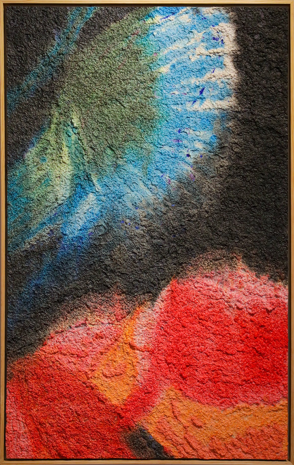 Working at a scale of 64" × 40", Burt creates richly layered compositions using recycled paper pulp as paint, turning discarded materials into expressive surfaces. The result is a body of work that is both visually striking and rooted in sustainable practice.